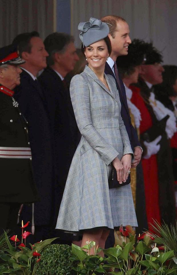 After rumors of another difficult first trimester, the royal appears healthy and glowing in a gray plaid coat dress, topped off with a slate-hued Jane Taylor fascinator.